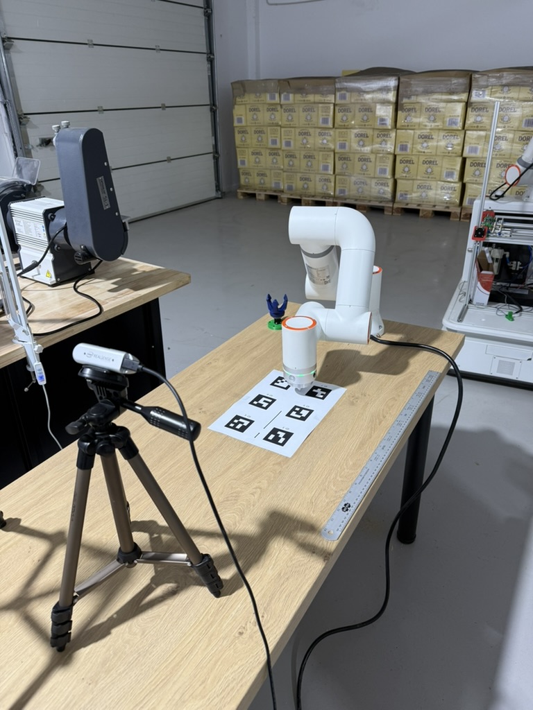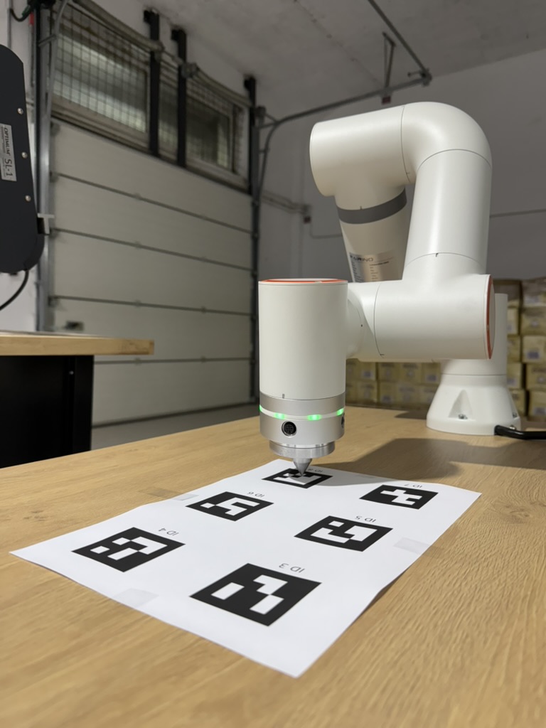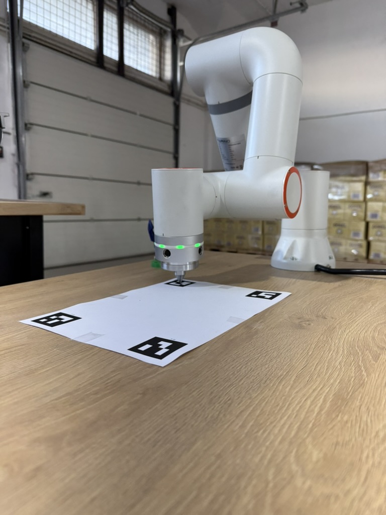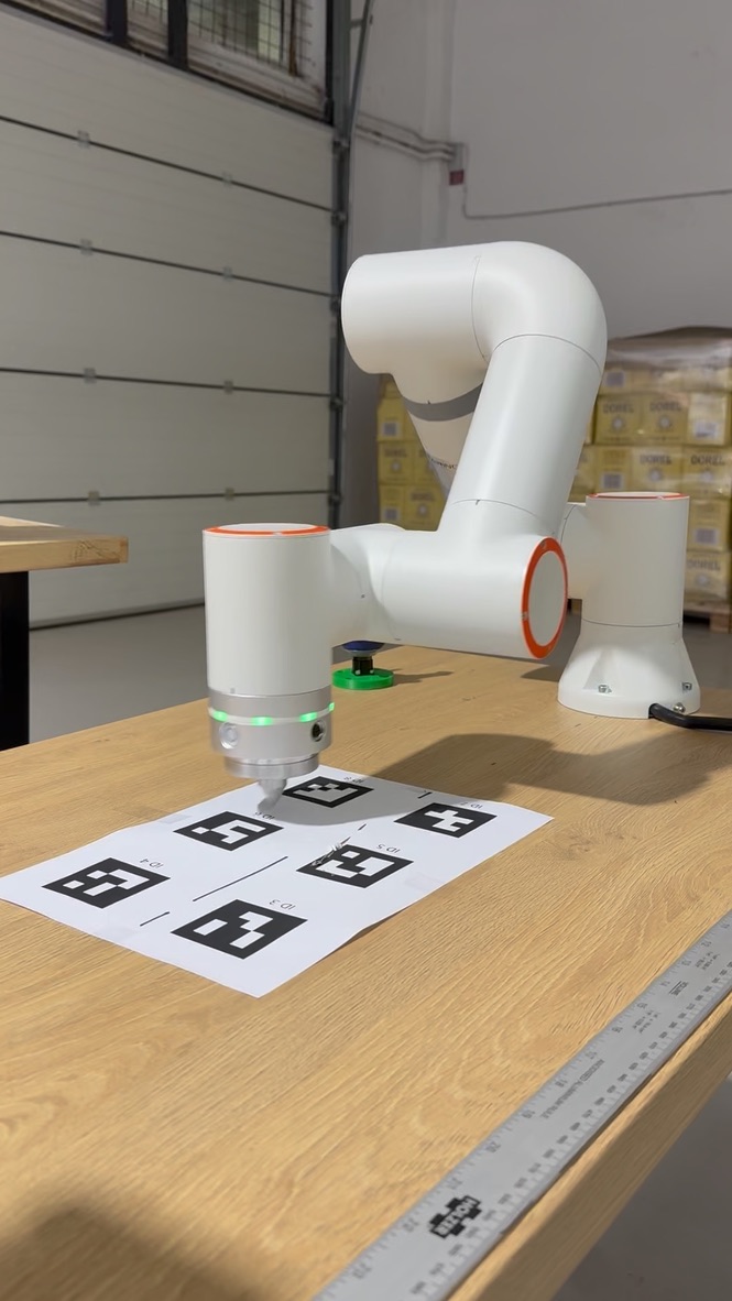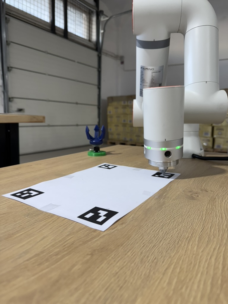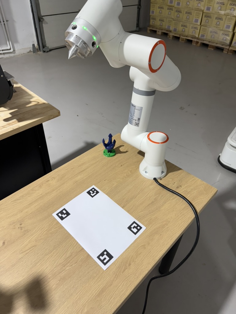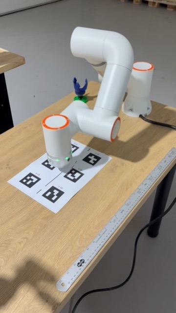 - Developed an automatic camera-to-robot calibration routine: the robot moves an ArUco marker through ~100 known poses, logging robot and camera data to compute and validate the transformation matrix
